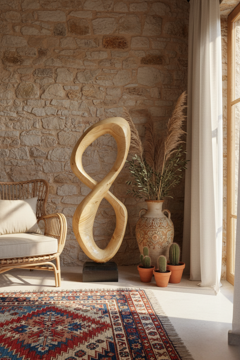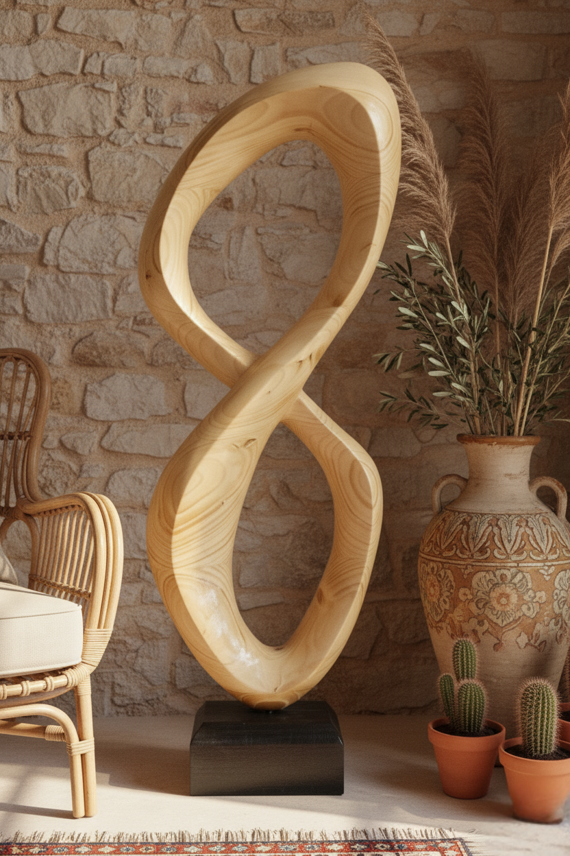 Ürün İsmi: "Tamu" Abstract Wooden Sculpture Ürün Boyutu: 80x31x14 cm Açıklama:Sonsuzluk formunu andıran bu heykel, tek parça köknar ağacından el ile oyularak şekillendirilmiştir. Akışkan çizgileri ve yumuşak kıvrımlarıyla organik modern tasarımı yansıtır. Minimalist, çağdaş ve İskandinav iç mekanlarda doğal bir uyum sağlar.