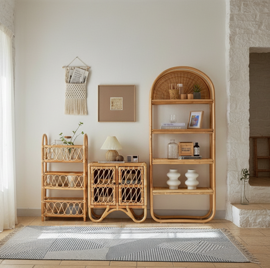 Dekoratif Raf Ünitesi: Setin en büyük parçası olan bu raf ünitesi, yuvarlak kemerli üst kısmı ve zarif hatlarıyla dikkat çeker. Kitaplarınızı, dekoratif objelerinizi ve bitkilerinizi sergilemek için ideal bir alandır. Bambunun hafifliği sayesinde kolayca taşınabilir ve evin farklı köşelerinde kullanılabilir.