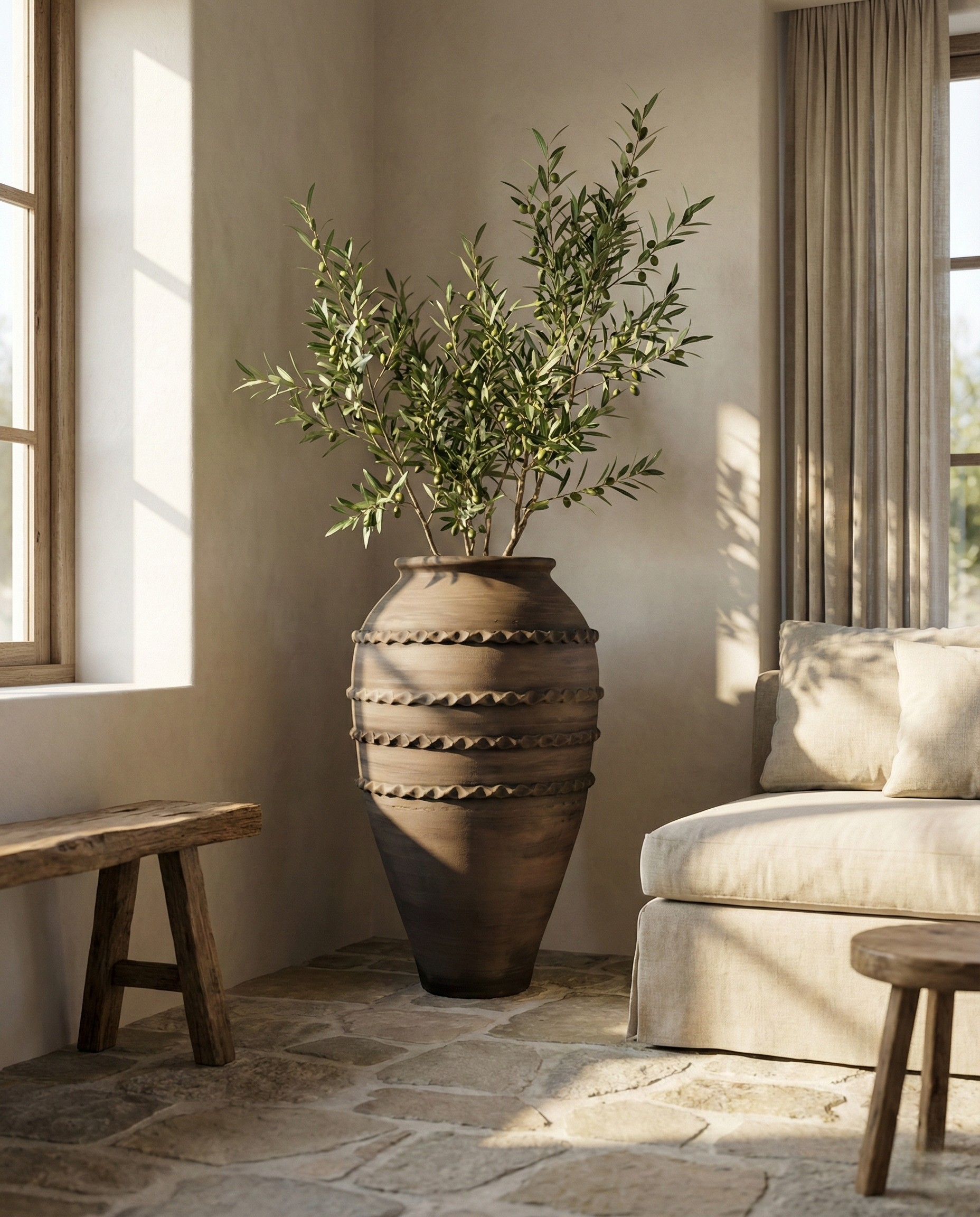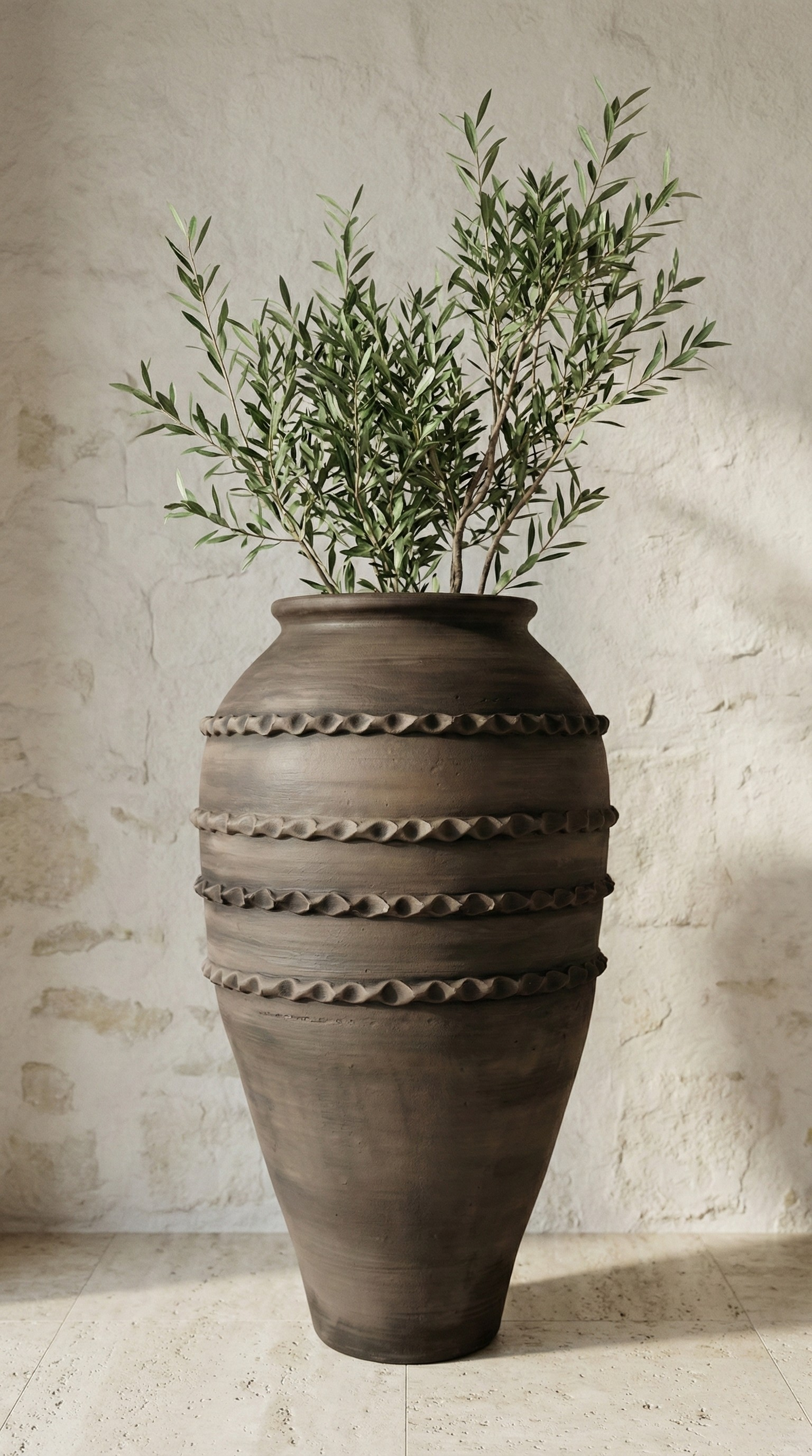 Doğal kilin geleneksel pişirme sürecinde kazandığı koyu ve derin tonlar, gövdeyi çevreleyen kabartmalı bant detaylarıyla birleşerek ürüne zamansız ve güçlü bir karakter kazandırır.Heykelsi formu sayesinde masa üstü kullanım için değil; salon köşeleri, giriş alanları, geniş yaşam alanları, villa ve butik otel mekânları, avlular ve yarı açık alanlar için tasarlanmıştır.