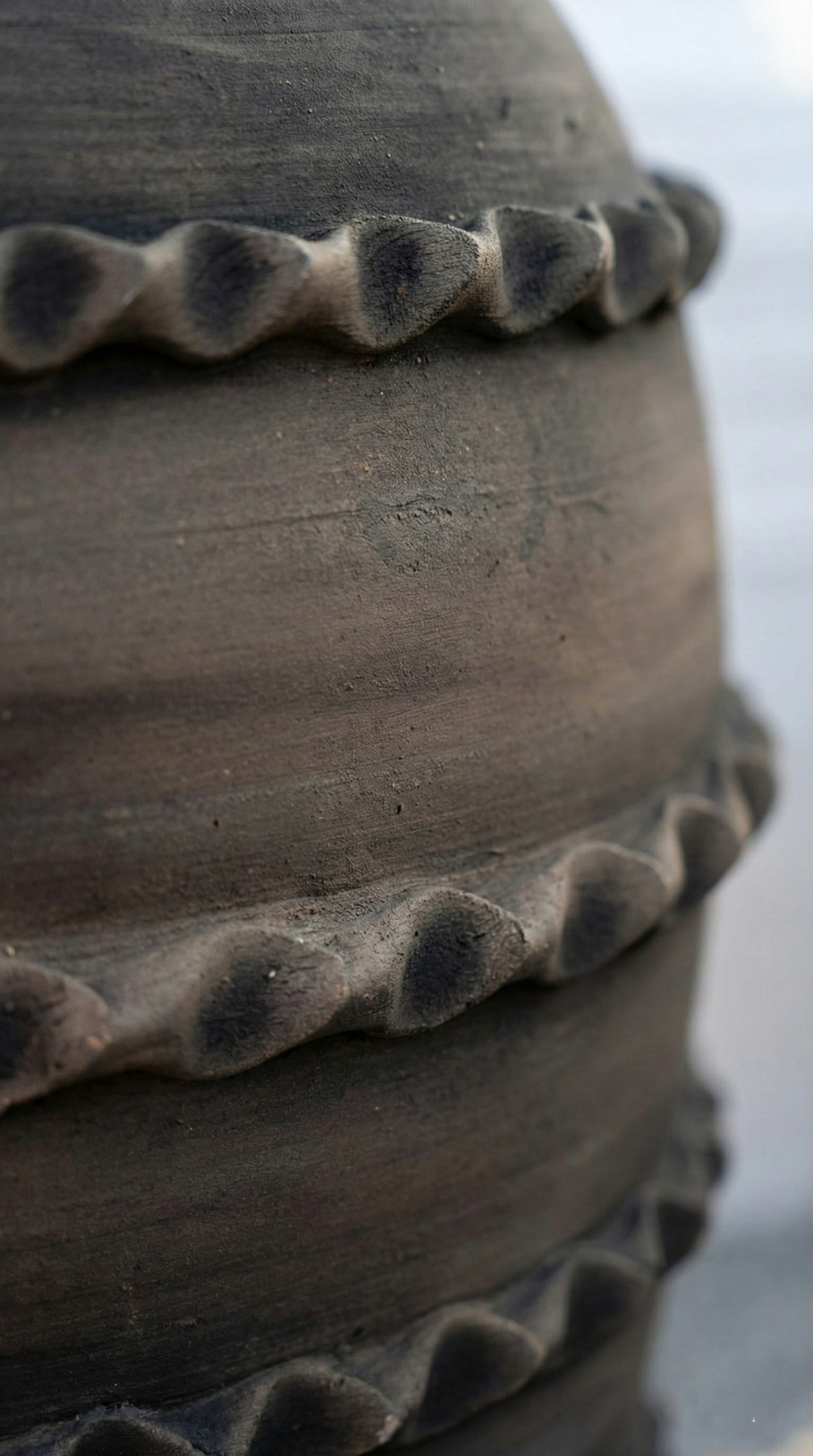Doğal kilin geleneksel pişirme sürecinde kazandığı koyu ve derin tonlar, gövdeyi çevreleyen kabartmalı bant detaylarıyla birleşerek ürüne zamansız ve güçlü bir karakter kazandırır.
