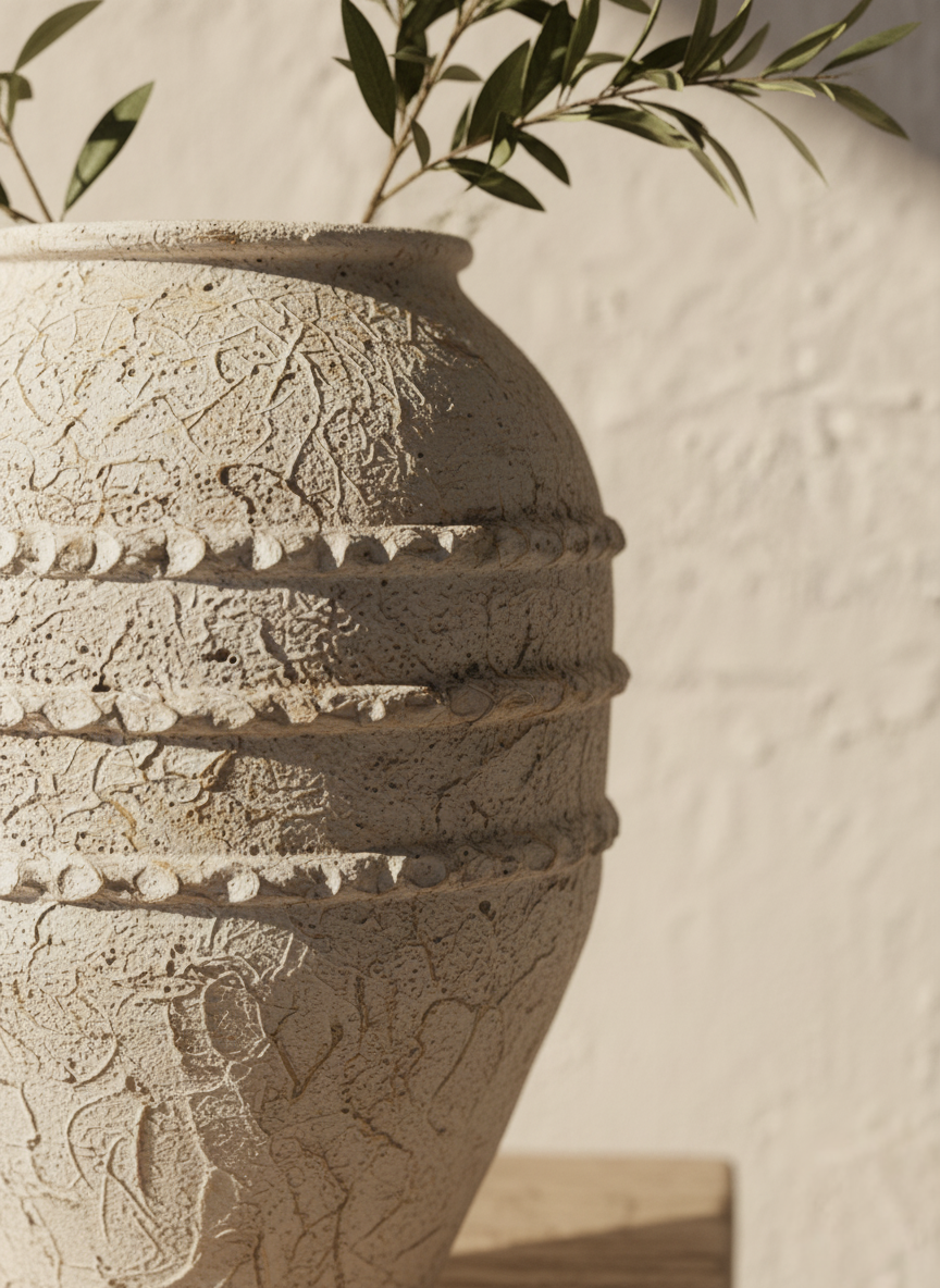 Farklı boyut ve dokularıyla sunulan "Ege Rüzgarı" amphora'lar, ister tek başına güçlü bir sanatsal ifade olarak, ister zeytin dalları, pampas otu veya canlı bougainvillea çiçekleriyle süslenerek yaşam alanlarınıza ruh katmak için tasarlanmıştır. Beyaz badanalı duvarlar, taş zeminler ve doğal ahşap detaylarla çevrili bir Ege evinin sıcaklığını ve rahatlığını mekanınıza taşıyın. Işığın oyunlarıyla dans eden dokular ve deniz esintisini anımsatan doğal tonlar, evinize sofistike ve huzurlu bir hava katacak.