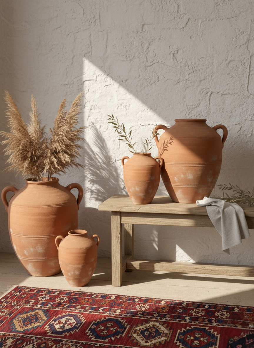 Evlerinize sıcaklık, otantiklik ve Akdeniz'in huzurlu ruhunu katmak ister misiniz? Terra Rustik Amphora Koleksiyonumuz, yüzyıllık bir zanaatkarlığın modern yaşam alanlarına taşıdığı eşsiz parçalardan oluşuyor. Her biri özenle el yapımı olan bu terracotta amphoralar, doğal kilin sıcak tonlarını ve rustik dokusunu bir araya getirerek evinize benzersiz bir karakter katıyor.