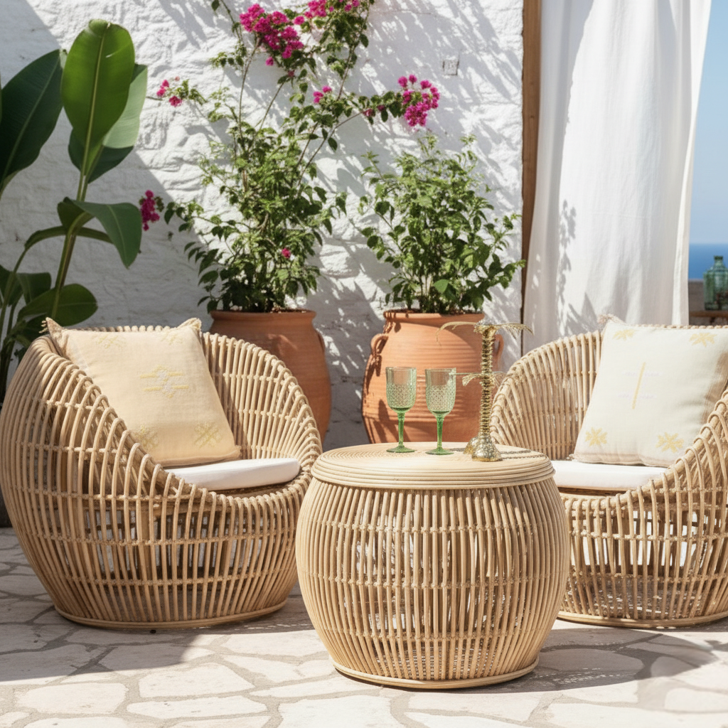 Özel Tasarım: Yuvarlak ve organik hatlara sahip bu takım, bambu kamışlarının ustalıkla işlenmesiyle oluşturuldu. Hem göz alıcı hem de ergonomik olan bu tasarım, uzun sohbetlerin ve dinlendirici anların vazgeçilmezi olacak.