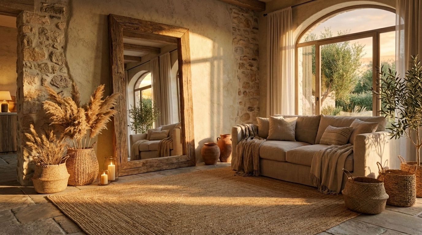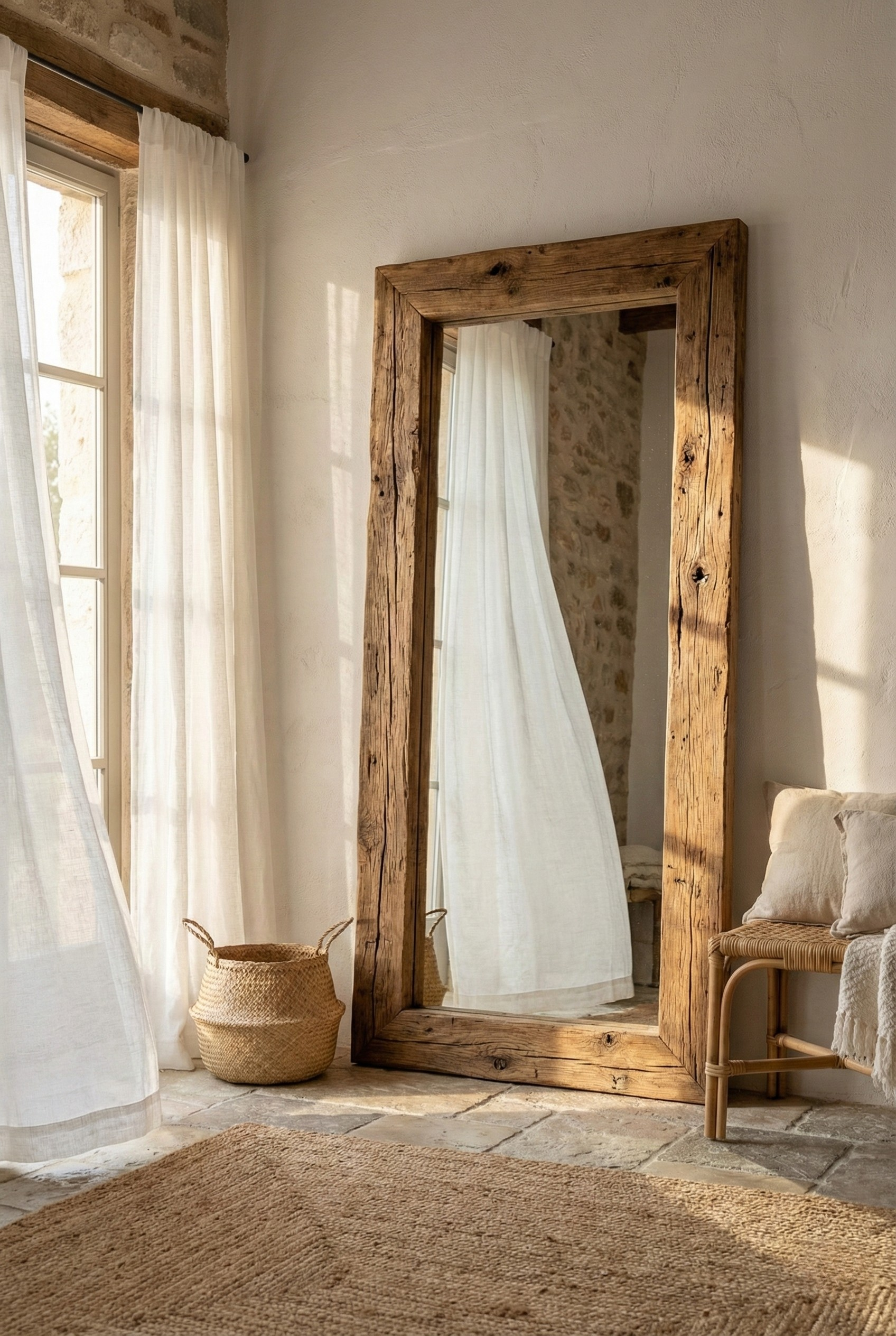Rustik çerçevesi, Urla’nın taş evlerinden ve Ege’nin sade mimarisinden ilham alır. Duvara yaslanarak kullanılan formu sayesinde mekâna hacim kazandırır, doğal ışığı yumuşak bir şekilde yansıtarak yaşam alanını daha ferah ve dengeli hissettirir.